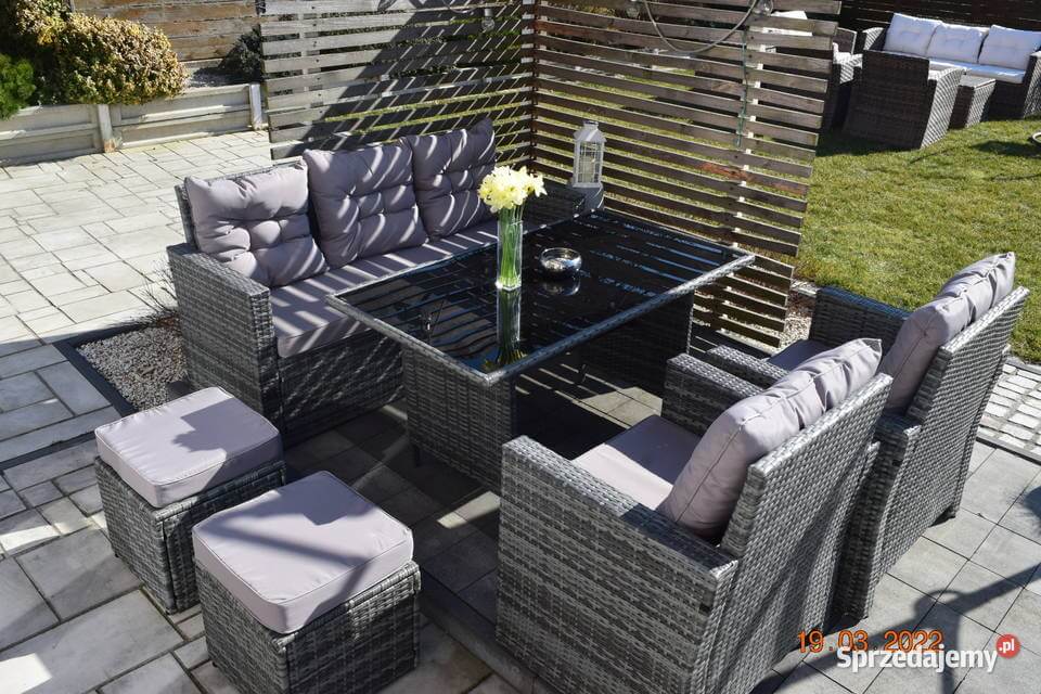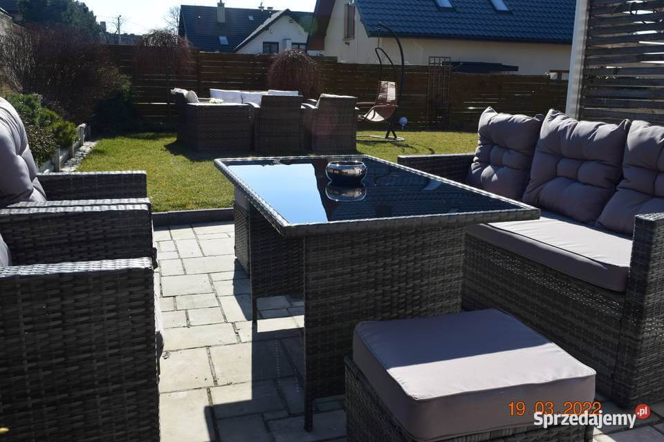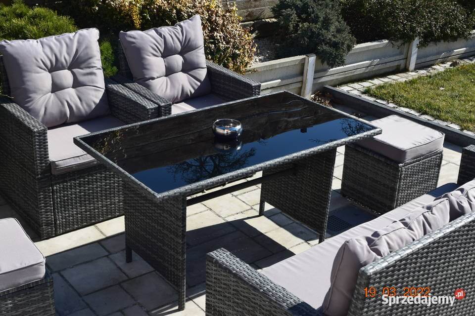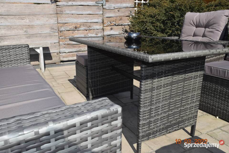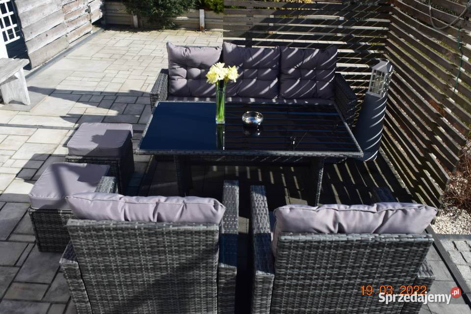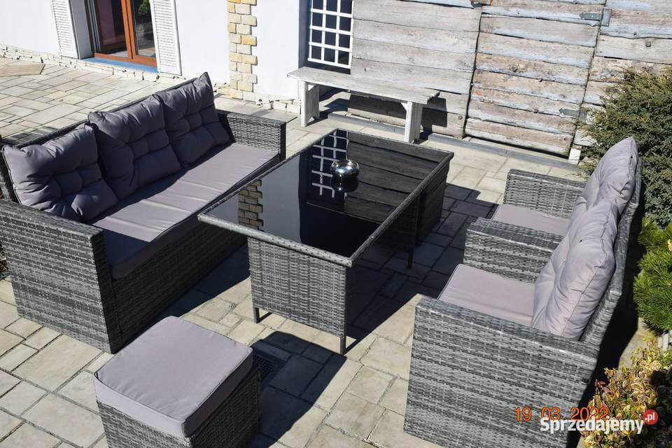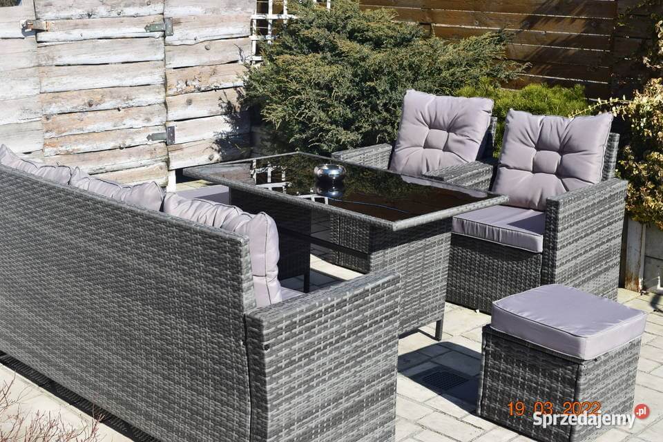 Wykonany z technologicznego rattanu w modnym, szarym melanżu, zestaw mebli eleganckich do ogrodu doskonale wpisuje się w nowoczesne trend designs, urozmaicając elewację domu lub aranżację przydomowego tarasu. Wymiary stołu, sofy, foteli i puf zostały starannie dobrane, aby stworzyć spójną i harmonijną całość, idealną do organizacji spotkań i rodzinnych uroczystości.
