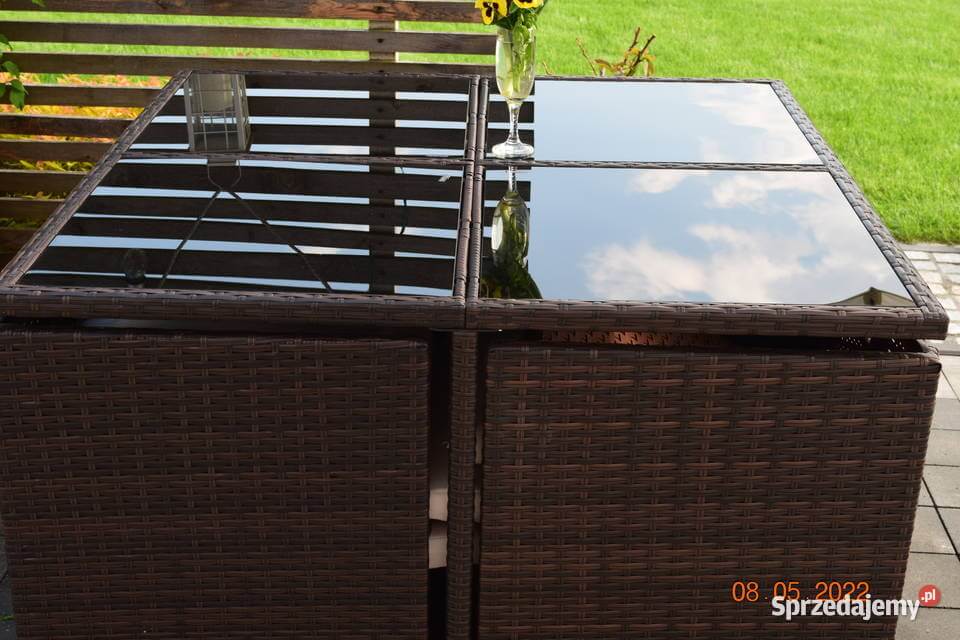 Meble ręcznie wyplatane na stalowej ramie zabezpieczonej ocynk oraz pomalowanej proszkowo. Blat stołu ze szkła hartowanego w kolorze czarnym o grubości 5mm.