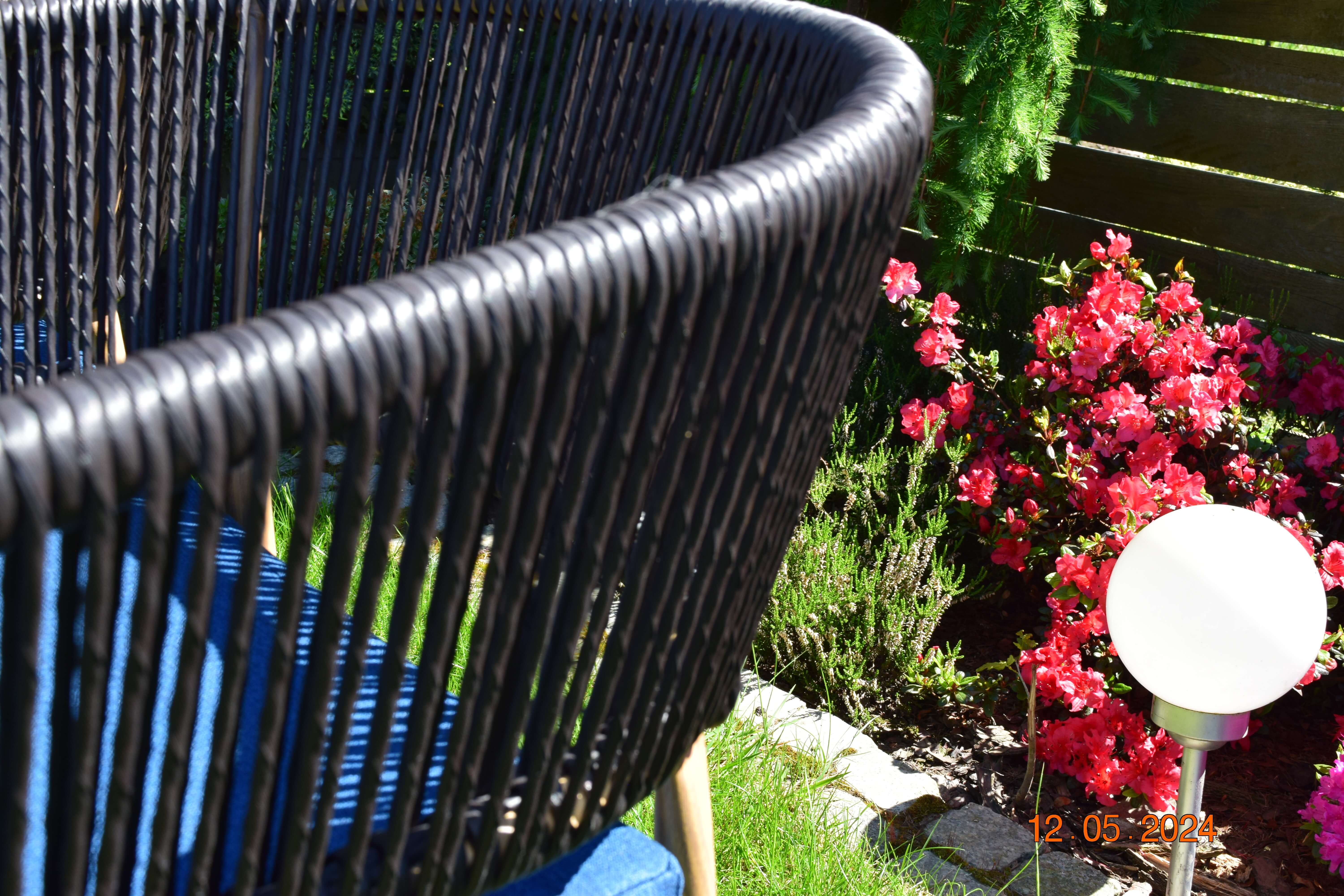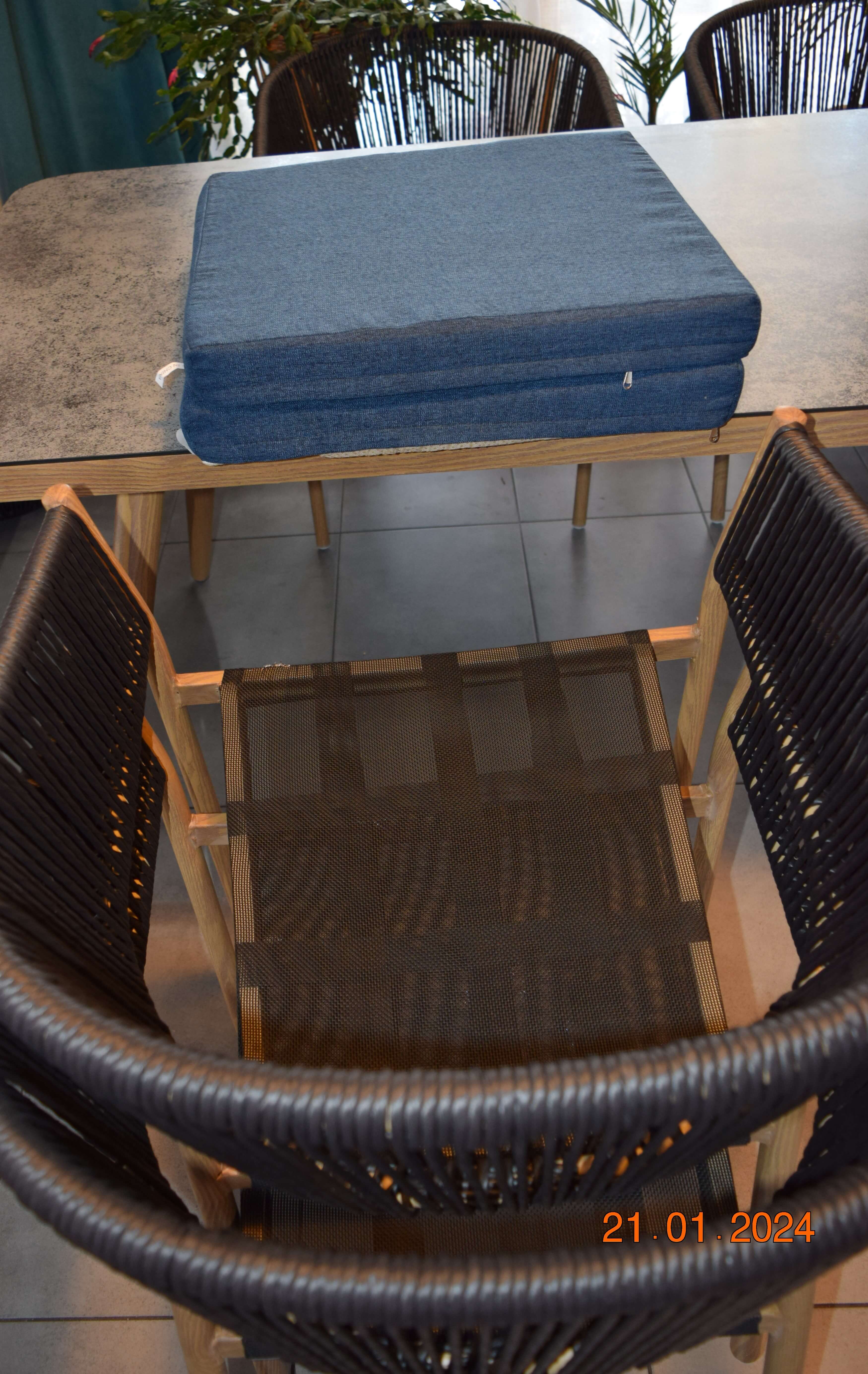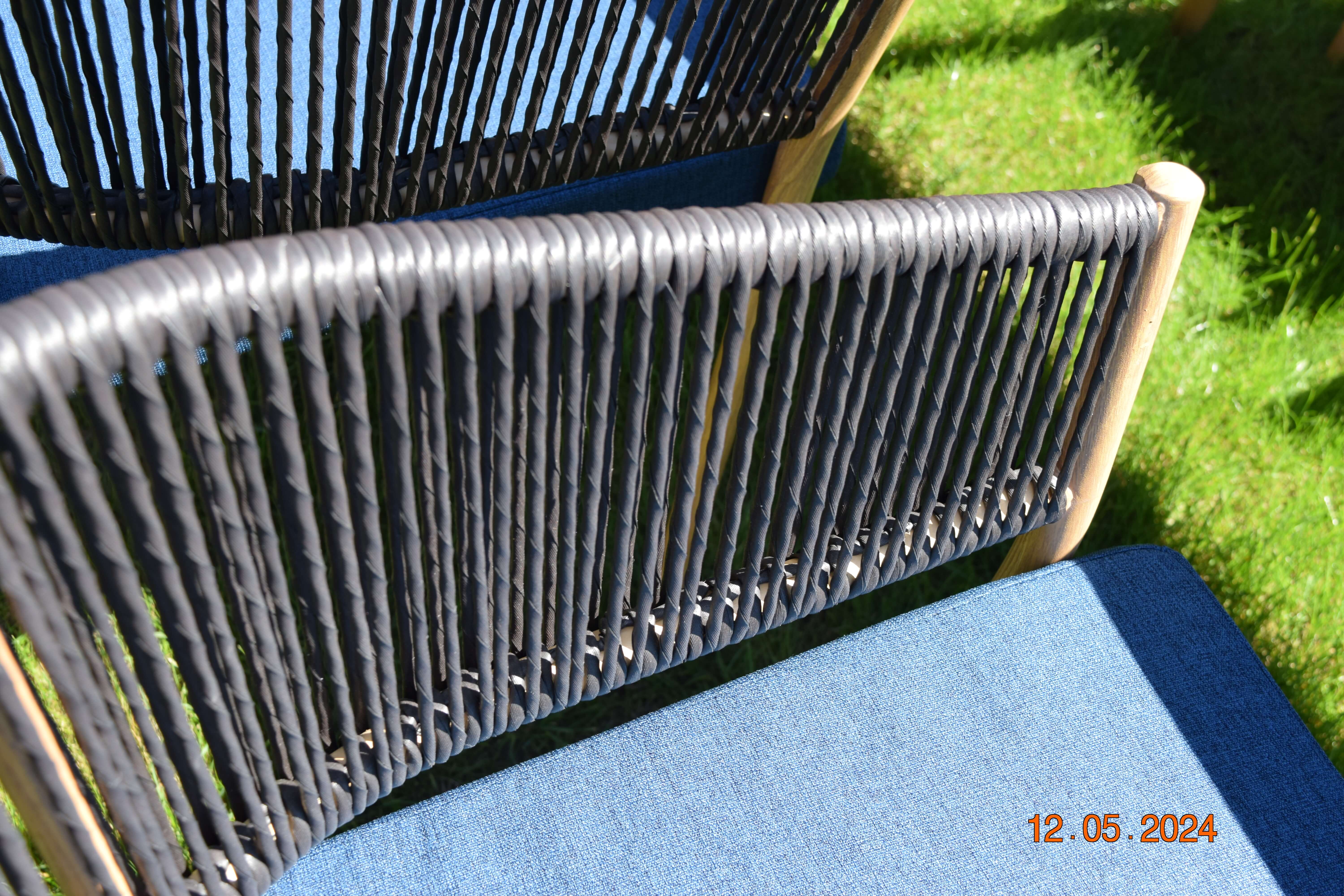 Eleganckie meble do ogrodu nabierają charakteru dzięki fantazyjnym poduszkom w kolorze oranż i szafiru, podkreślonym elementami imitującymi naturalne tkaniny. System błyskawicznych zameczków zapewnia łatwość czyszczenia, co z pewnością docenią osoby dbające o czystość swoich mebli ogrodowych. Dbałość o detale sprawia, że zestaw nadaje się zarówno do kameralnych spotkań, jak i większych garden party.