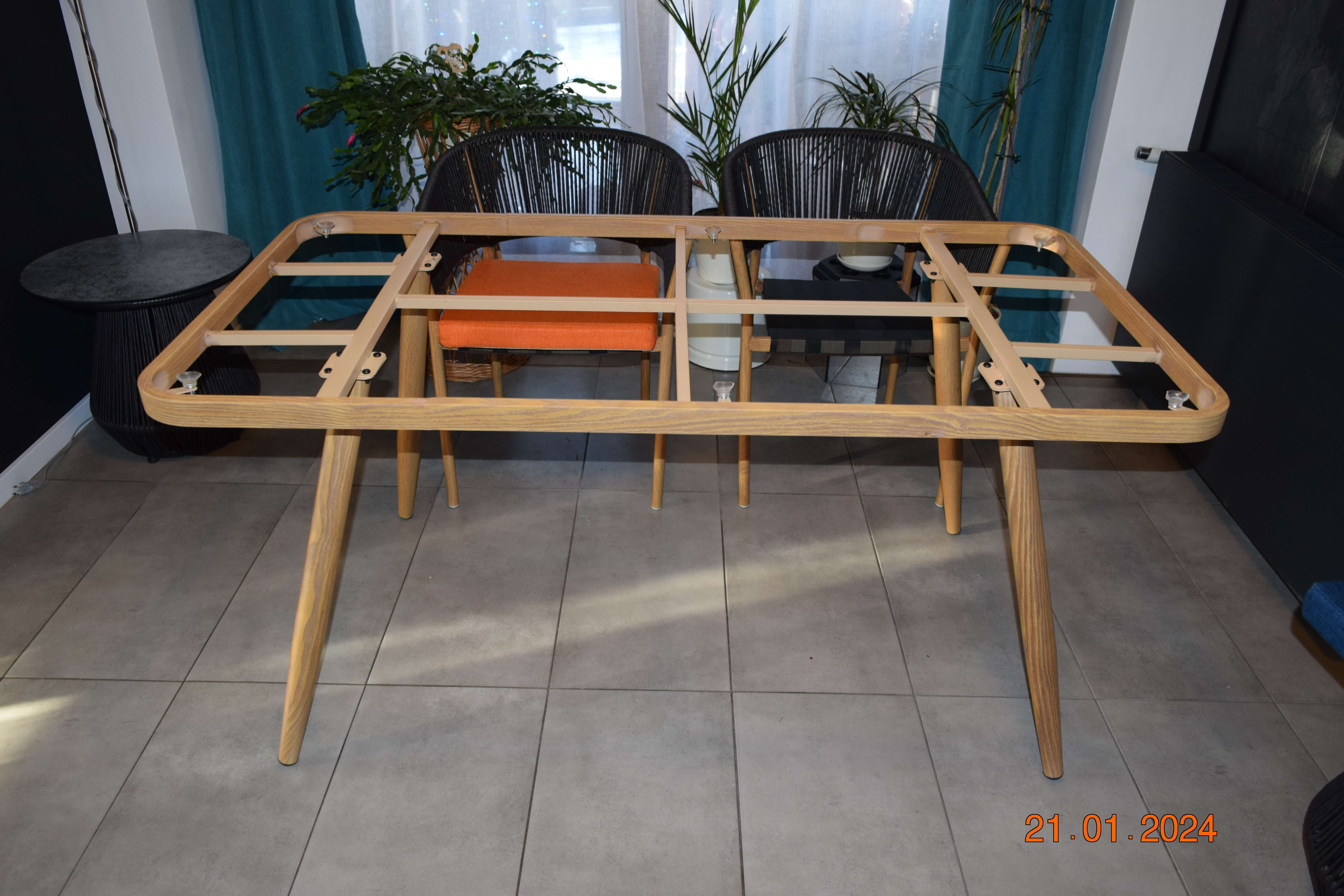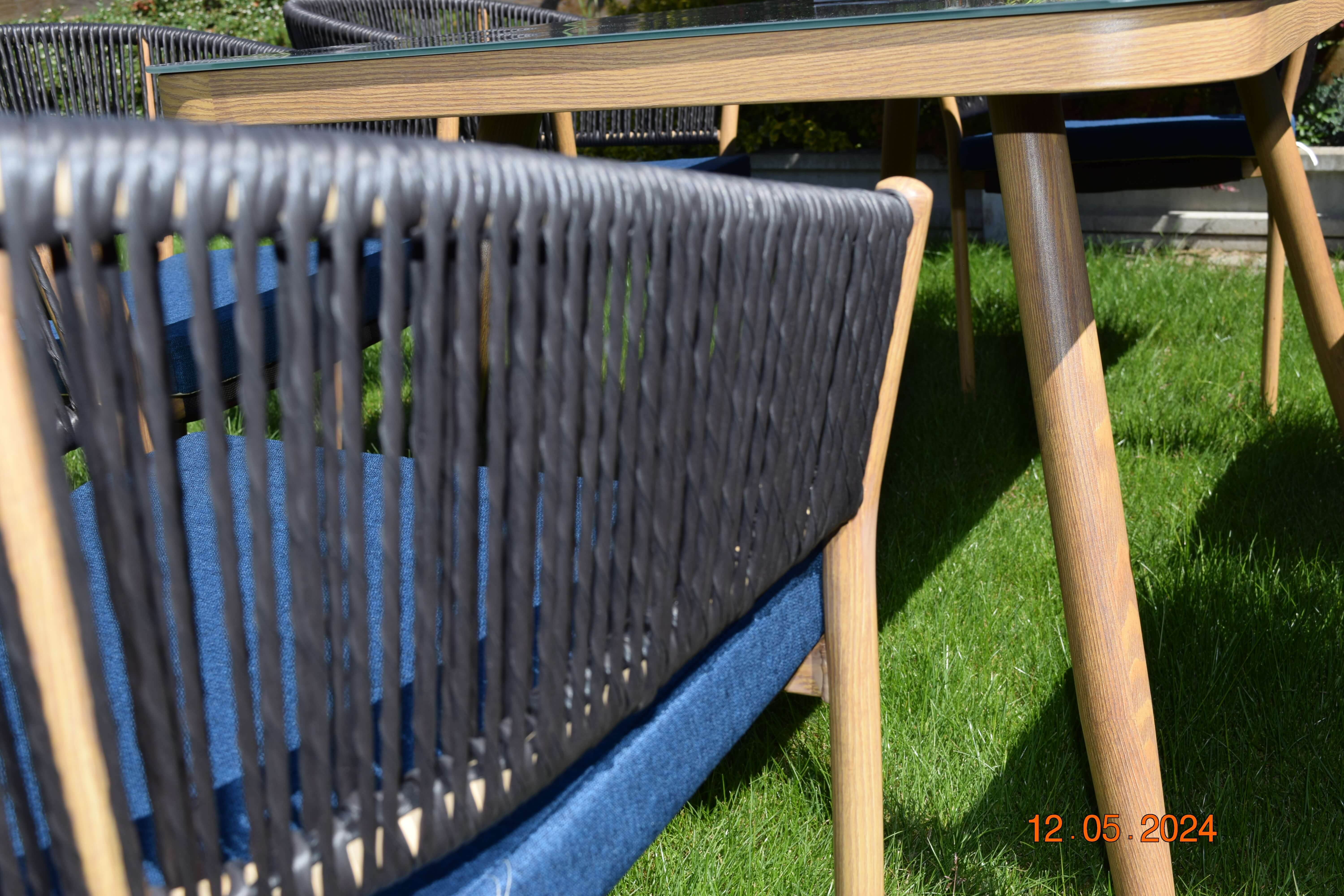 Meble ogrodowe "meblecilam" wykonane są z lekkiej stali pomalowanej proszkowo, imitującej strukturę drewna w eleganckim beżowym odcieniu. Dodatki z czarnego sznurka woskowego podkreślają prestiż zestawu oraz nadają mu nowoczesnego charakteru. To idealne rozwiązanie dla tych, którzy szukają eleganckich mebli do ogrodu i przestrzeni na taras.