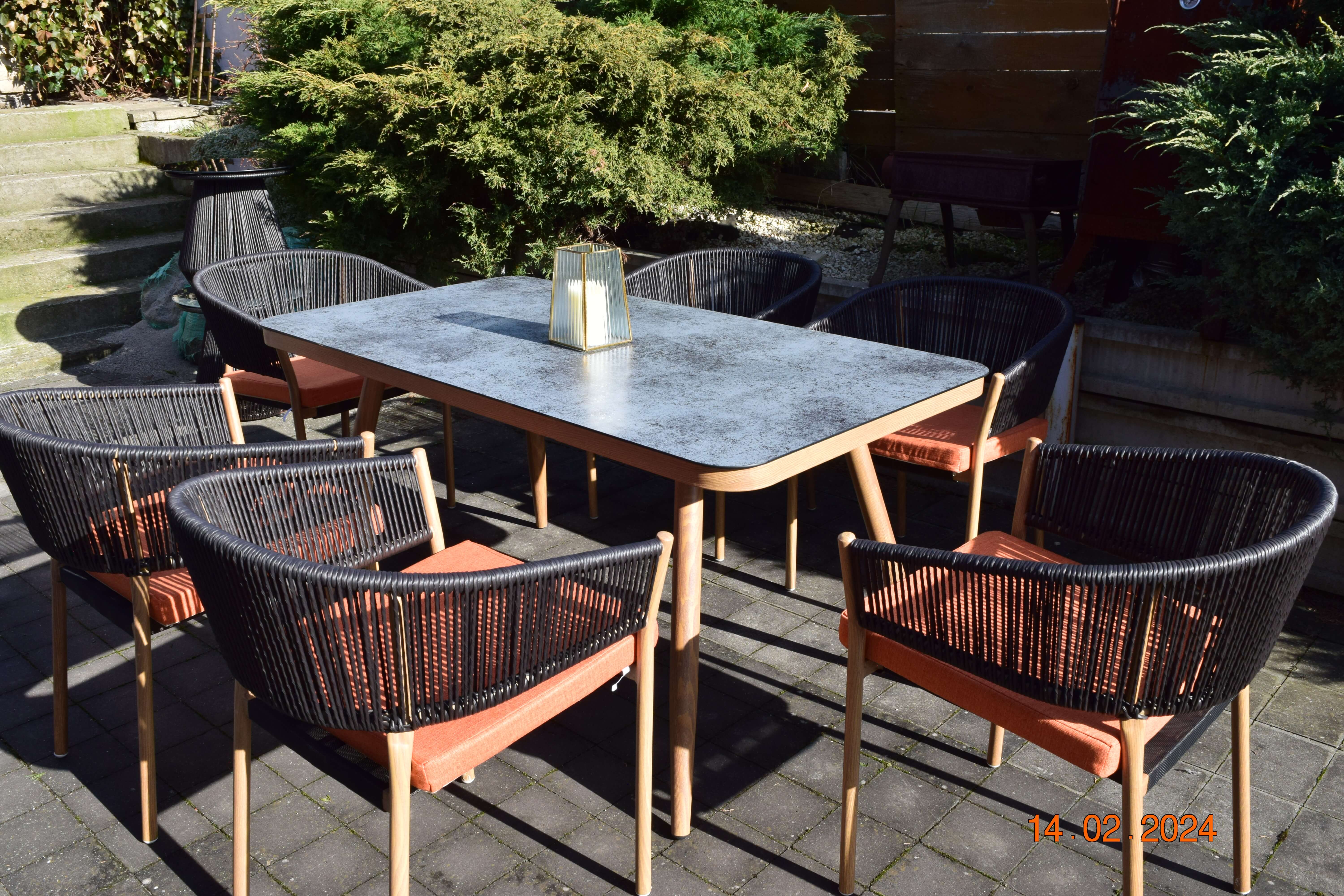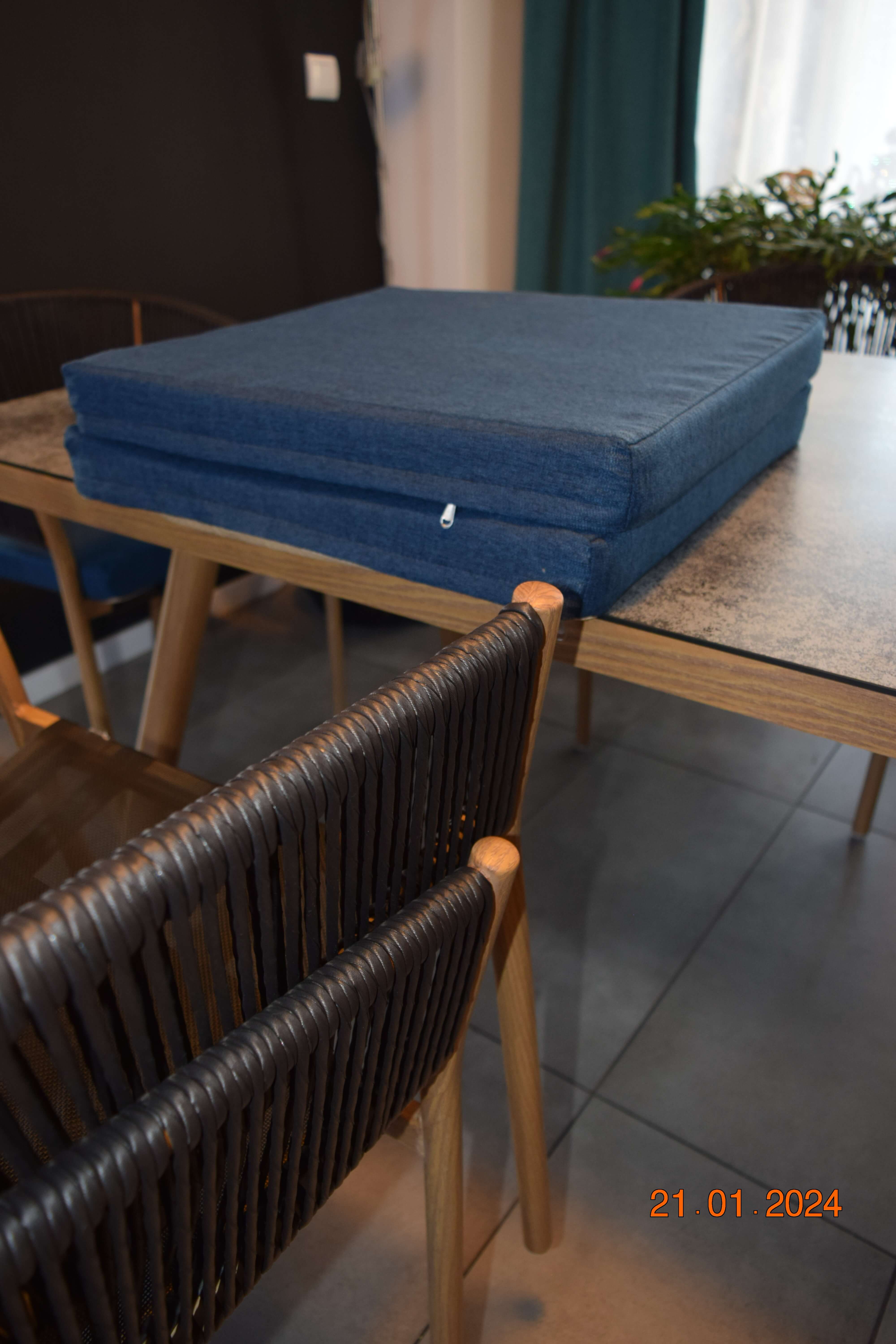 Wyjątkowe poduszki w kolorze oranż, szafiru z domieszką lnu i unikalnym wzorem lnu, podkreślają niepowtarzalny charakter tego jadalnianego zestawu ogrodowego. Wyposażone w błyskawiczne zameczki, umożliwiają łatwe utrzymanie czystości oraz konserwację – każdy detal został przemyślany z myślą o wygodzie użytkowania.