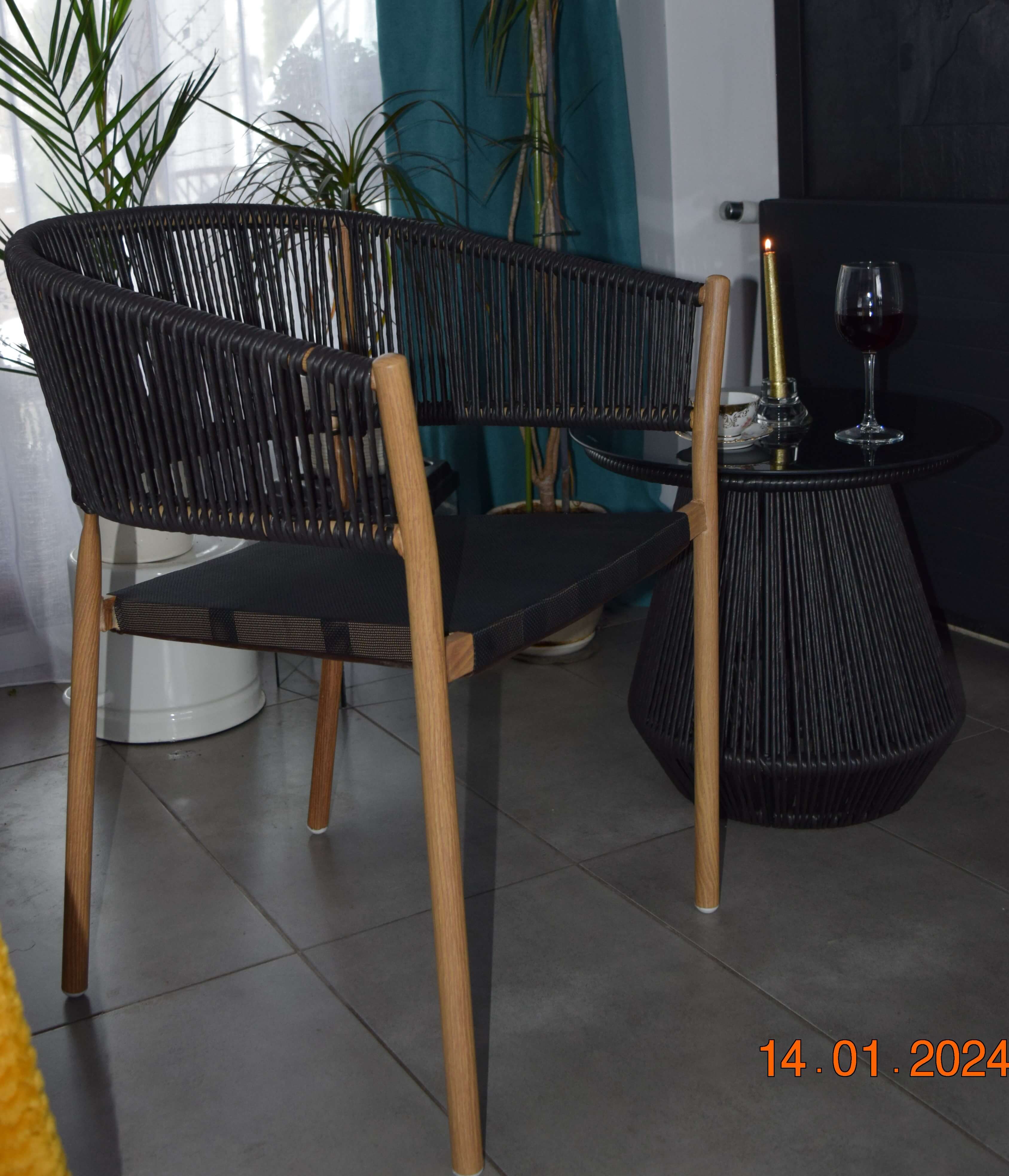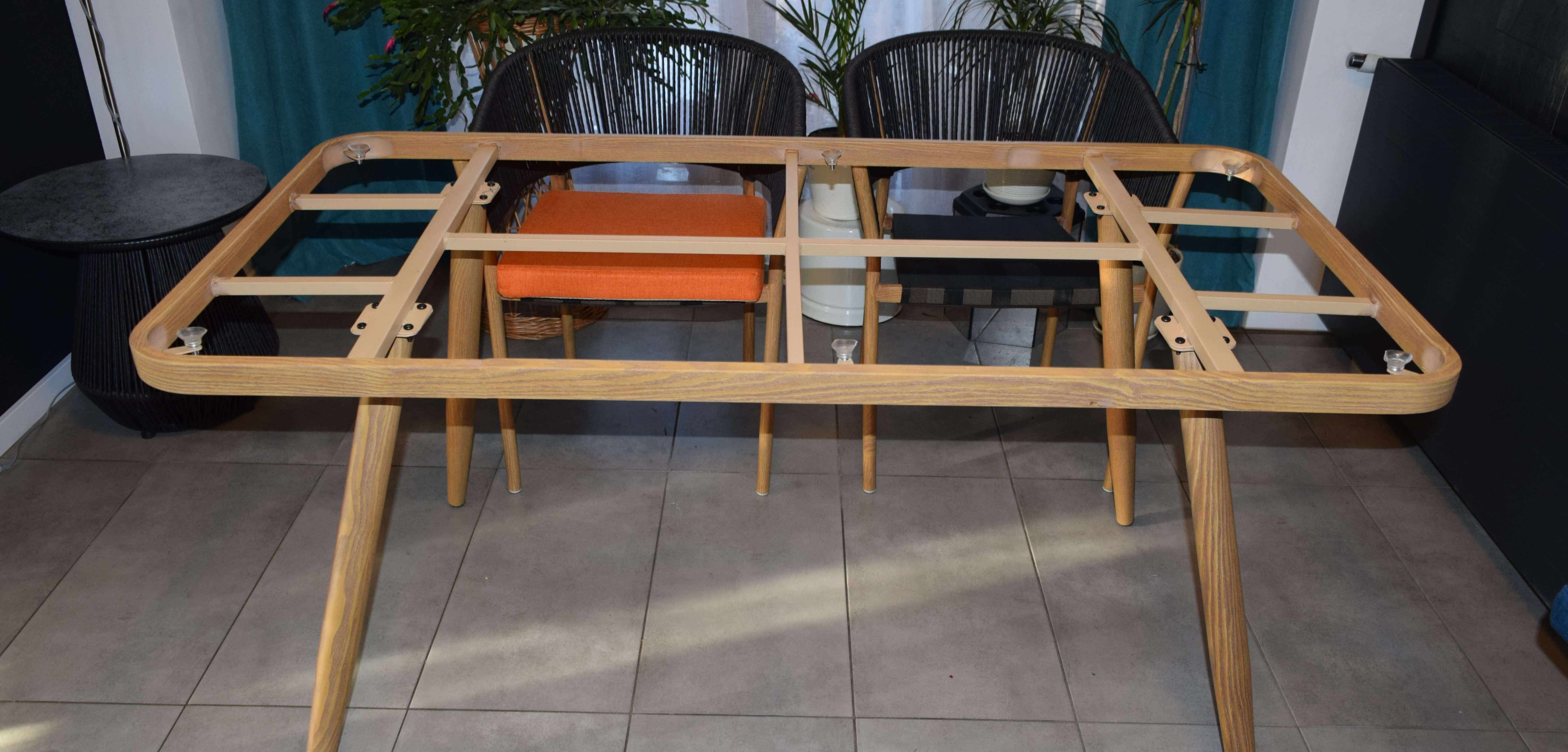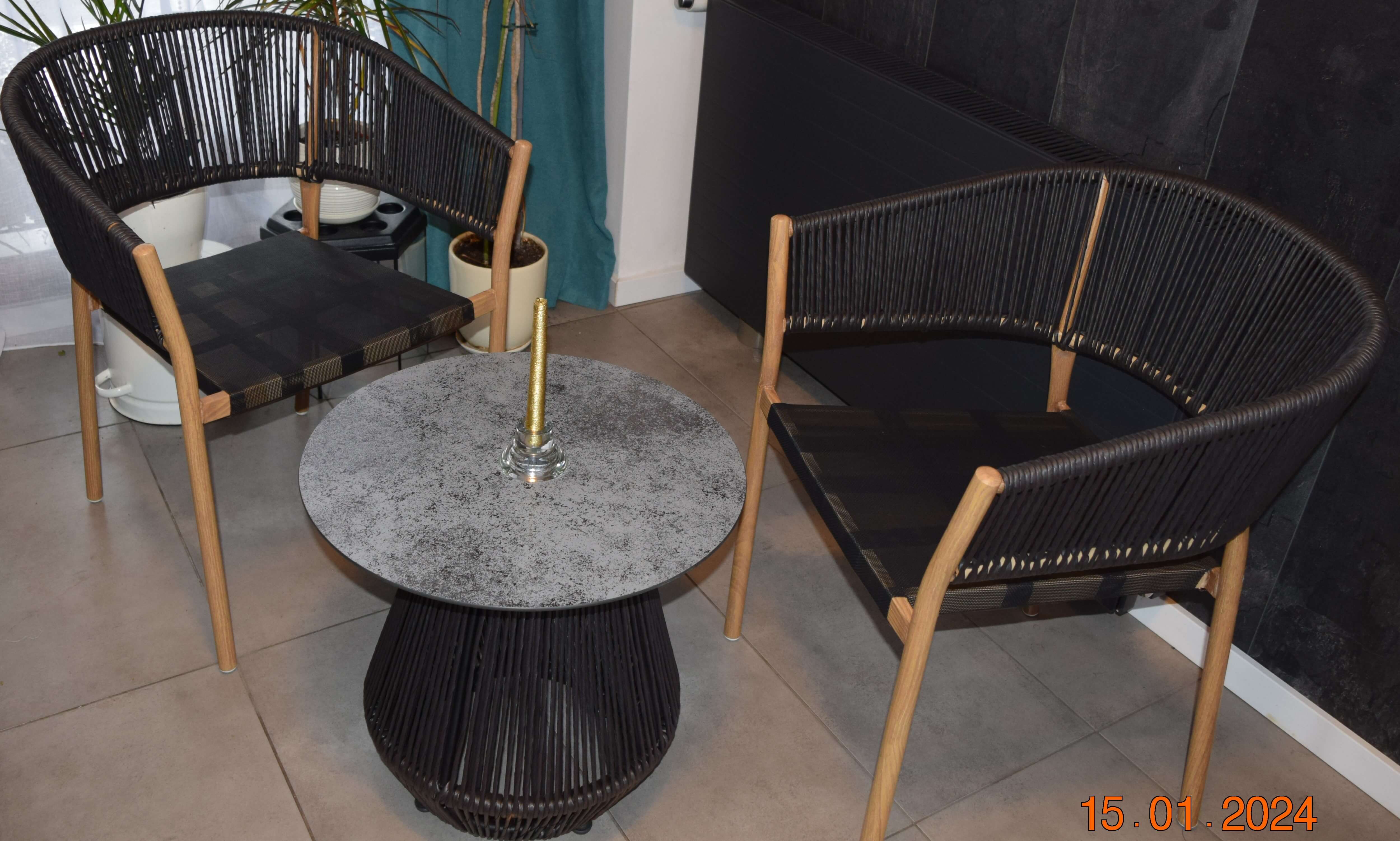 Stół oraz krzesła wykonane są z lekkiej stali, pomalowanej proszkowo, co gwarantuje trwałość i odporność na warunki atmosferyczne. Imitacja drewna w kolorze beż w połączeniu z czarnym sznurkiem woskowym nadaje zestawowi nowoczesny i modny charakter. To idealny wybór dla tych, którzy poszukują zestawu mebli ogrodowych z wysokim potencjałem dekoracyjno-estetycznym.